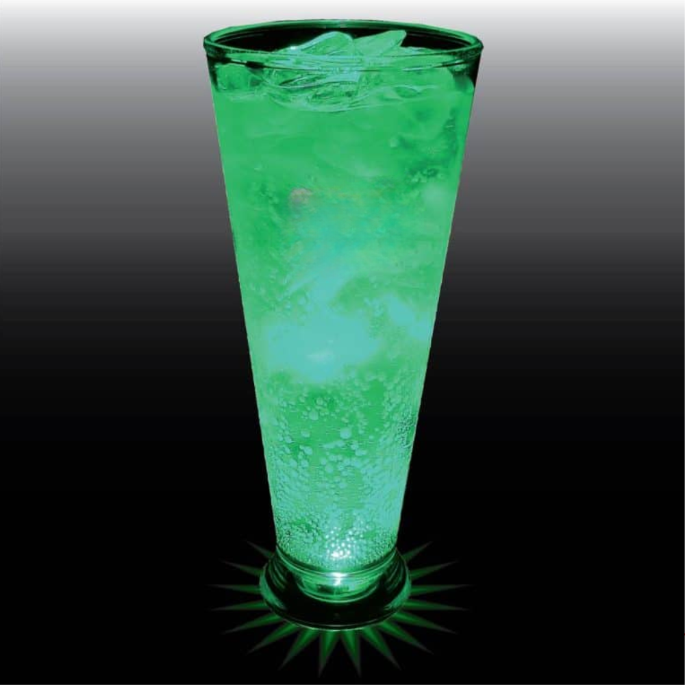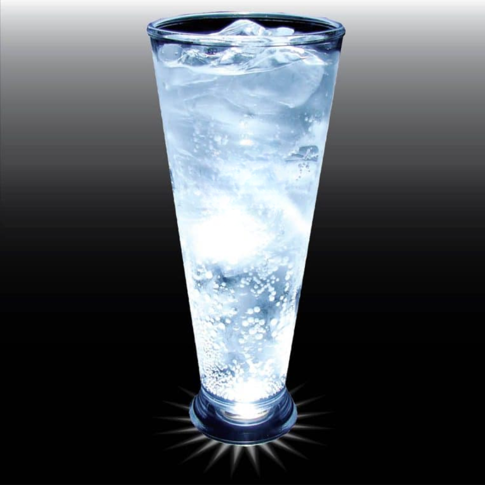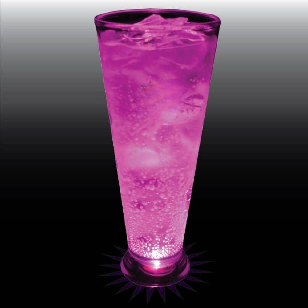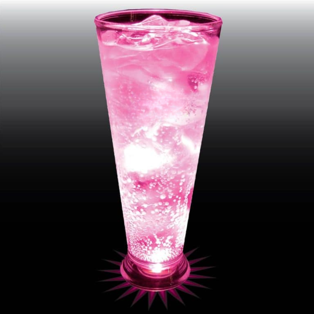 Enjoy the Glow: 16 oz. Clear Plastic Light-Up Pilsner Glass. Customize your ambiance with a choice of 8 LED light colors, including Red, Orange, Yellow, Green, Blue, Violet, Pink, and White. Switch between 2 dazzling light effects: blinking or constant on. Crafted in the USA from Clear Styrene Plastic, it features a one color, one location imprint, with options for multi-color, 2nd side, and full color process imprints. BPA free and recyclable, it comes with replaceable batteries included. Please hand wash only, and remember to remove electronics before washing.
