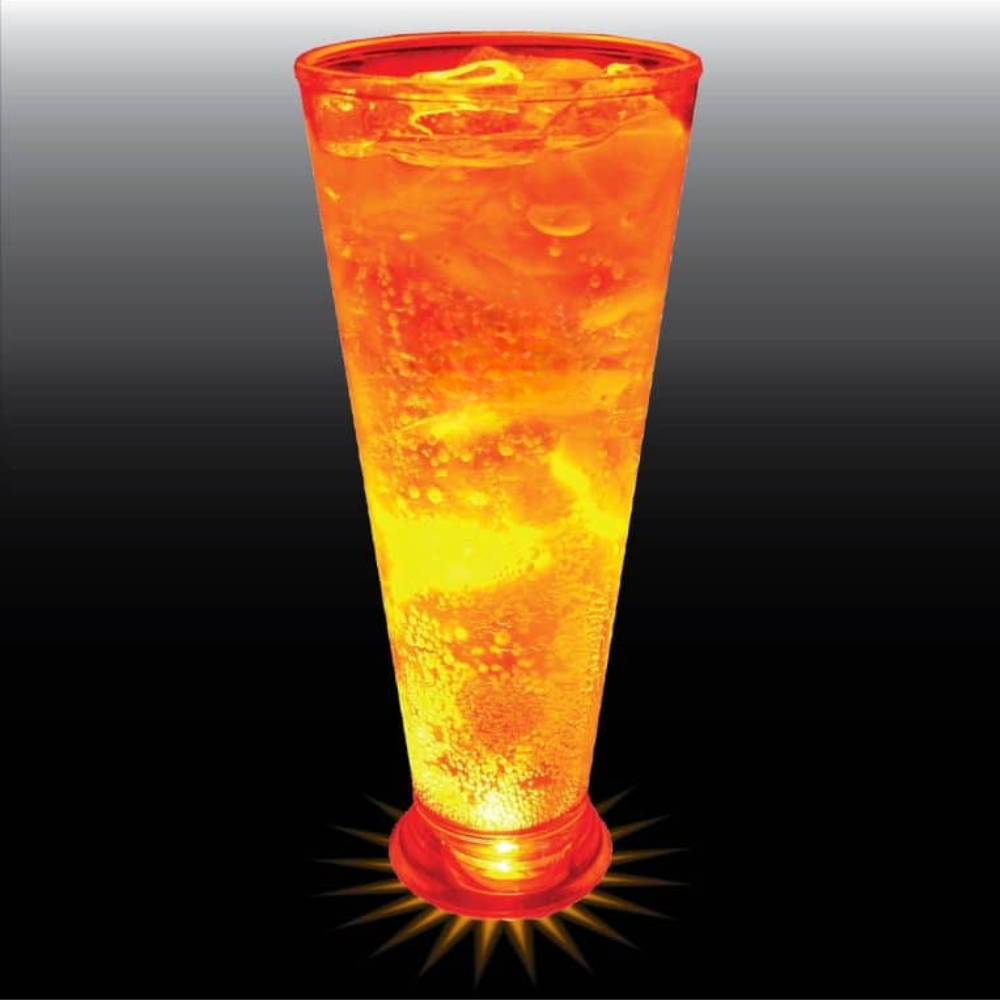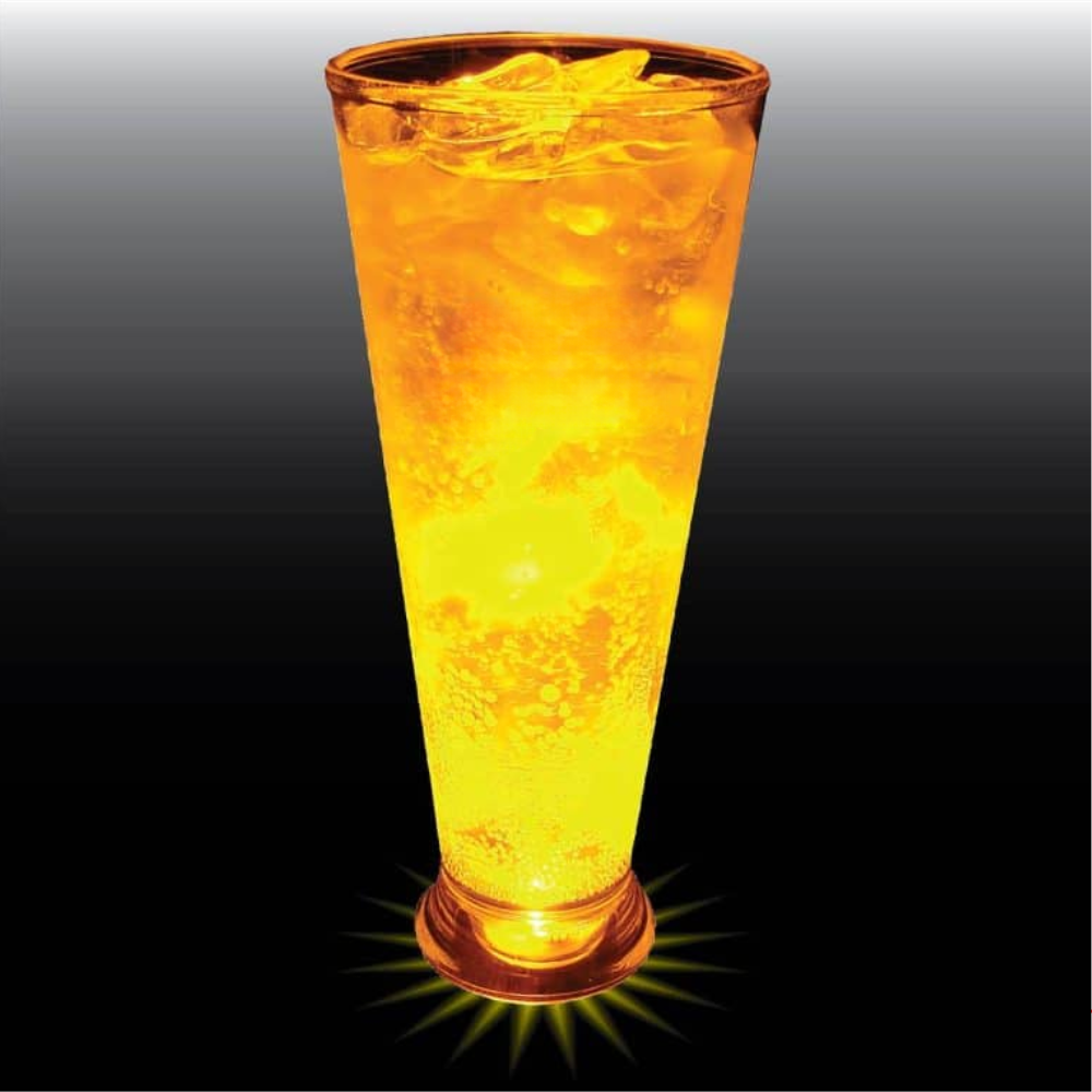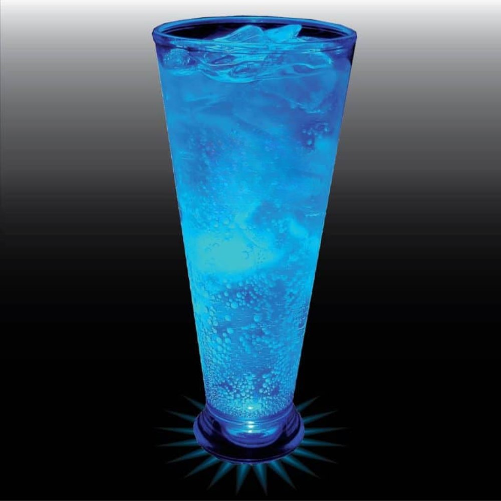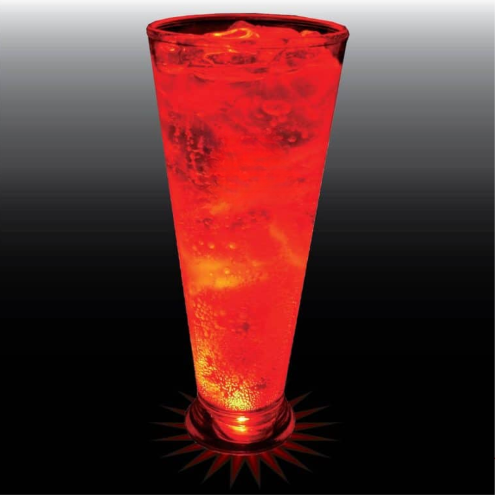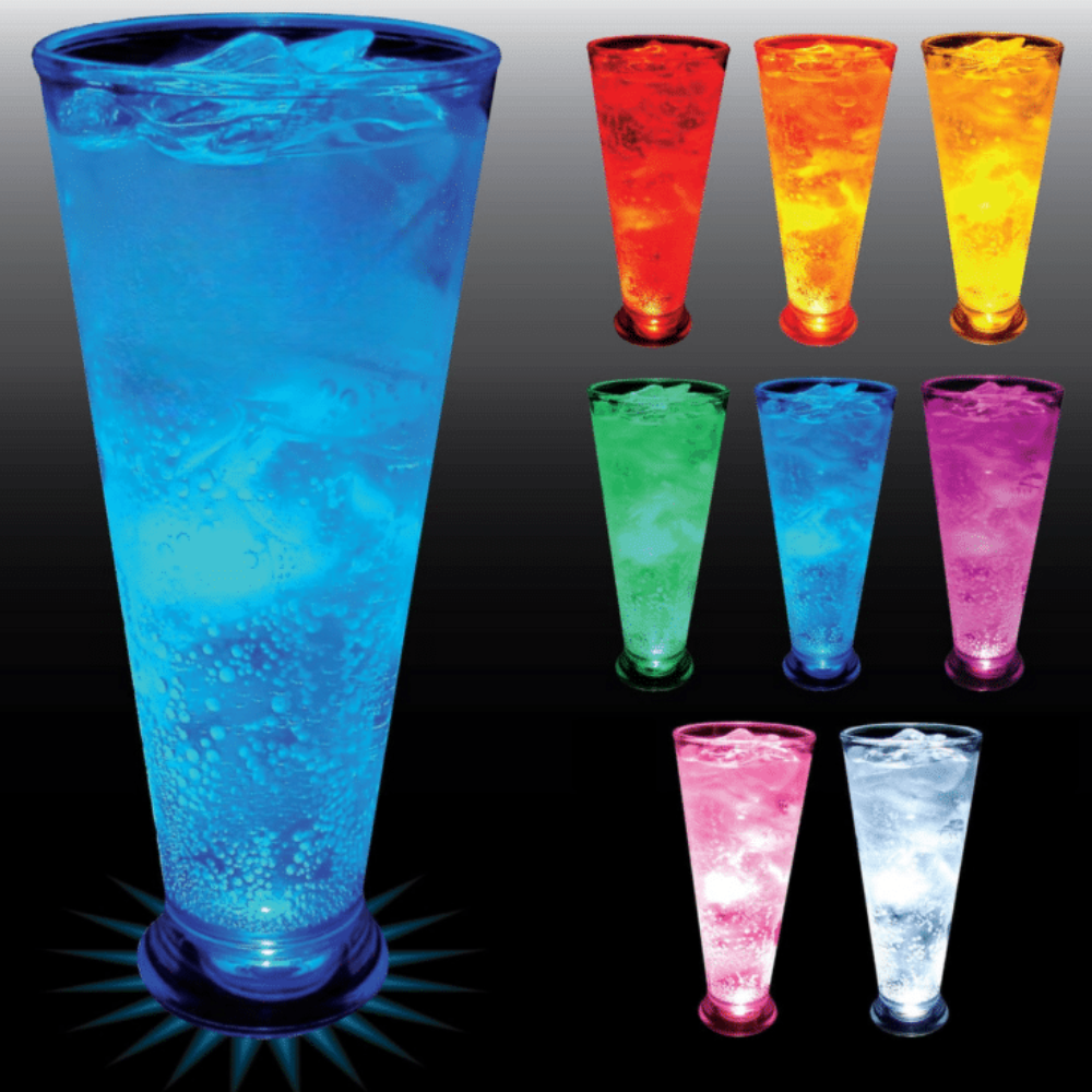 Enjoy the Glow: 16 oz. Clear Plastic Light-Up Pilsner Glass. Customize your ambiance with a choice of 8 LED light colors, including Red, Orange, Yellow, Green, Blue, Violet, Pink, and White. Switch between 2 dazzling light effects: blinking or constant on. Crafted in the USA from Clear Styrene Plastic, it features a one color, one location imprint, with options for multi-color, 2nd side, and full color process imprints. BPA free and recyclable, it comes with replaceable batteries included. Please hand wash only, and remember to remove electronics before washing.