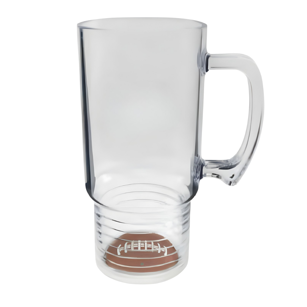 NEW 18 oz Sport Mug w/Handle is USA made from rugged crystal clear Styrene plastic with a 3D formed sports ball in the false bottom to give your sport a fun effect and entertain guests with their favorite beverage. Great for parties, sports themed restaurants & events. Prices include your choice of 4 stock sports themes and a one color, one side imprint. Additional imprint options available. Also available in 12 and 20 oz sizes. BPA free. Hand wash only.
