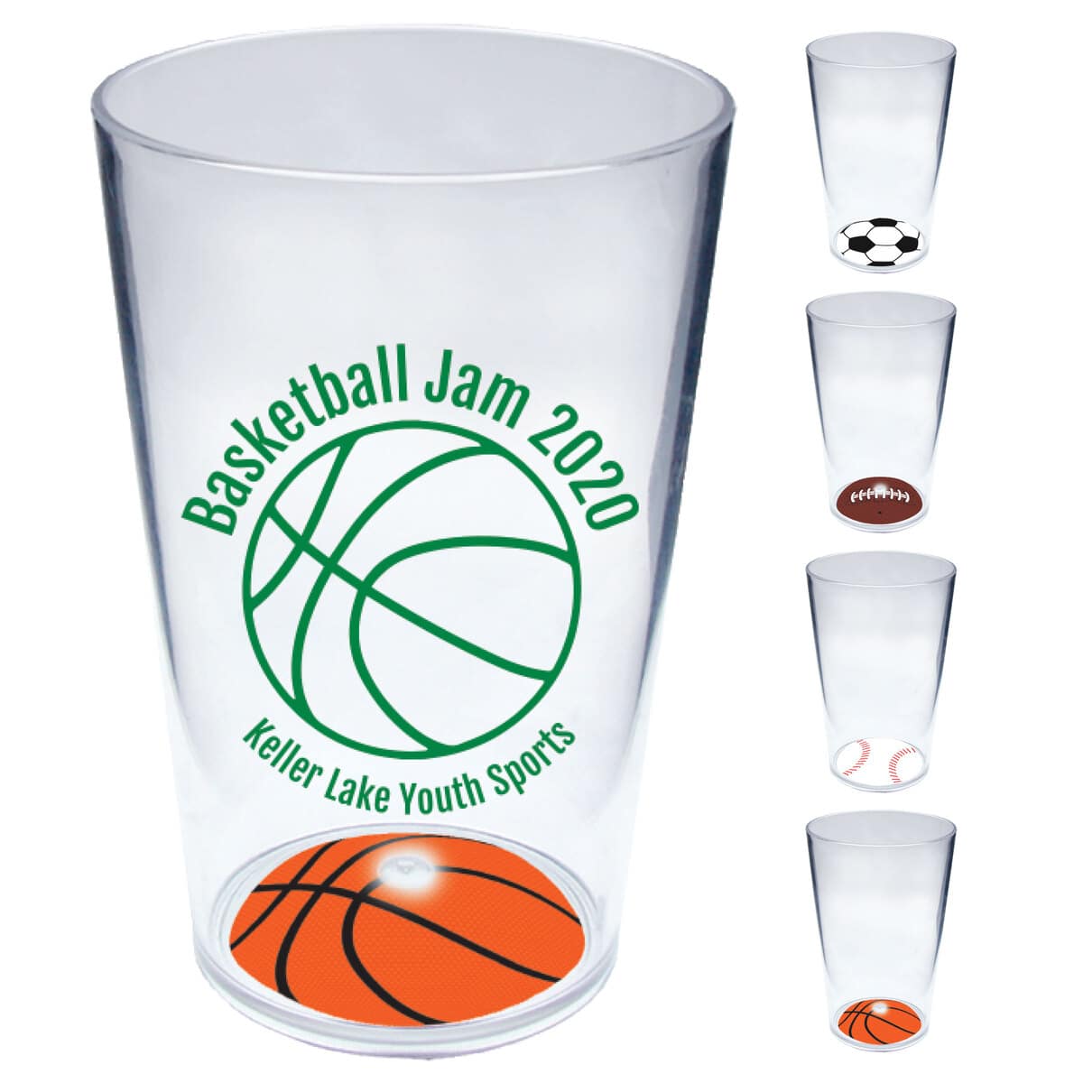 NEW 16 oz Sport Tumbler is USA made from rugged crystal clear Styrene plastic with a printed ball in the bottom to give your sport a fun effect and entertain guests with their favorite beverage. Great for parties, sports themed restaurants & events. Prices include your choice of 4 stock sports themes and a one color, one side imprint. Additional imprint options available. Available in 12, 16 and 20 oz sizes as well as an 18 oz Mug with handle. BPA free. Hand wash only.