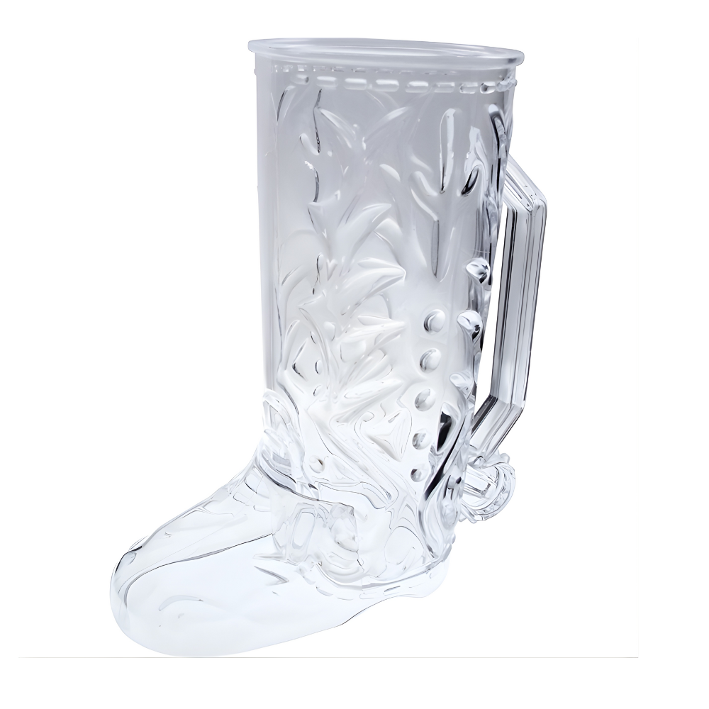 20 oz. Cowboy Boot Shaped Mug with Handle, Made in USA of heavy Clear Styrene Plastic. Perfect for indoor or outdoor use. Prices include a one color, one location imprint with options of additional spot color printing and full color process printing available. Recyclable, BPA free, and FDA approved.